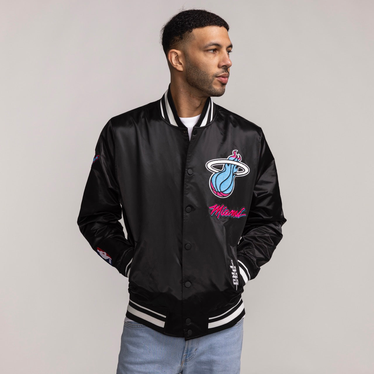 Black satin Miami HEAT jacket with blue and pink HEAT logo patch on sleeve and striped cuffs. - Pro Standard Miami HEAT Original Vice Satin Jacket
