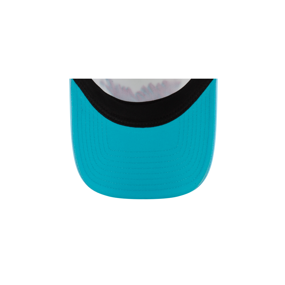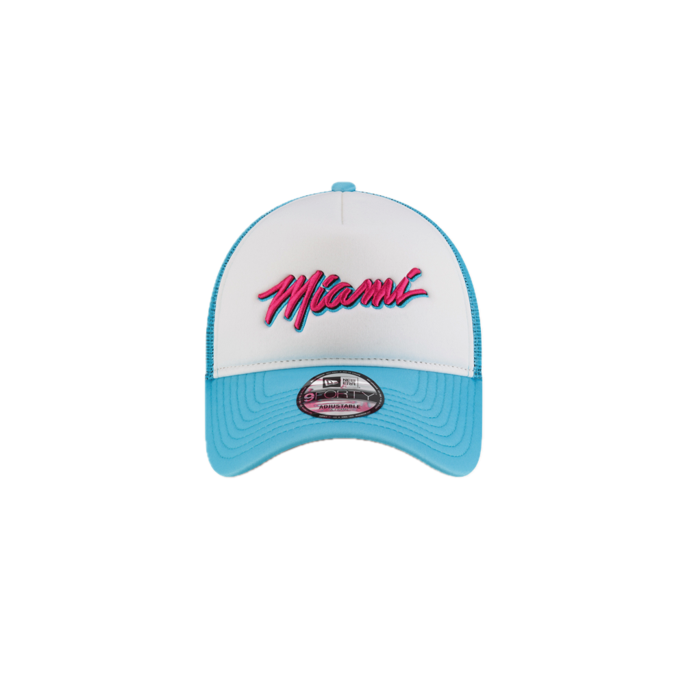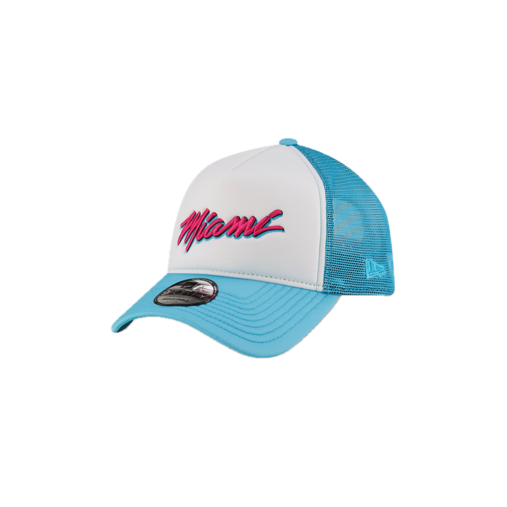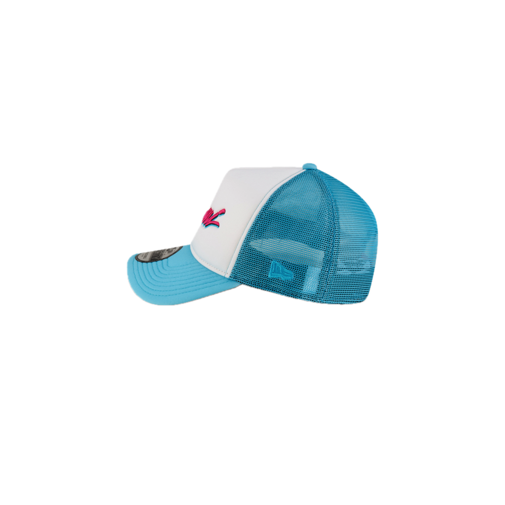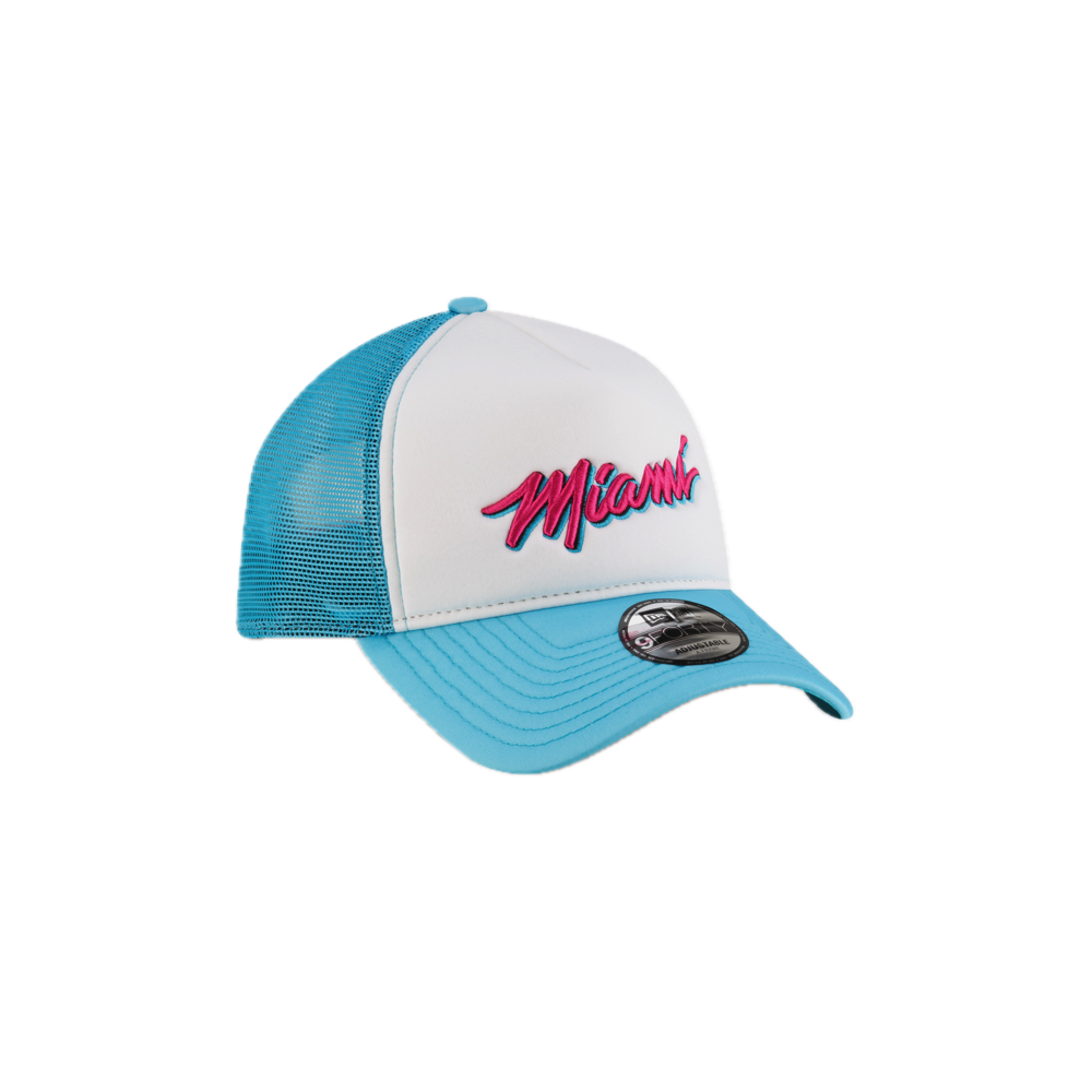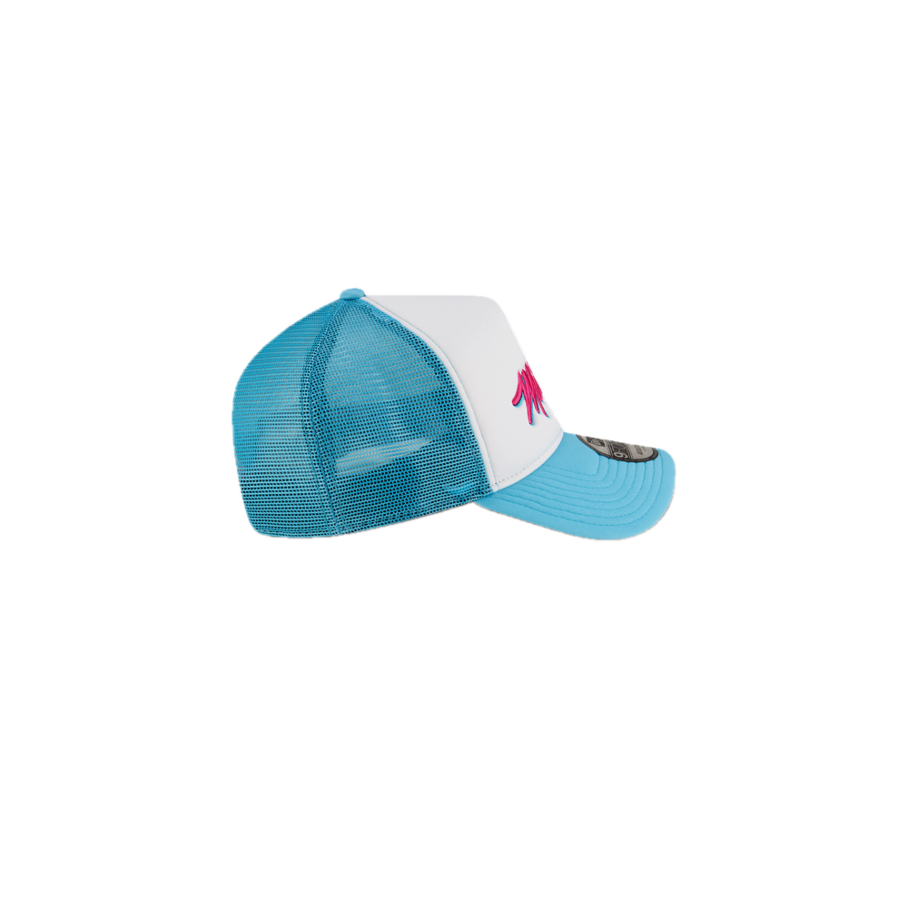 White and light blue trucker cap with pink Miami palm tree logo and blue mesh back panel.