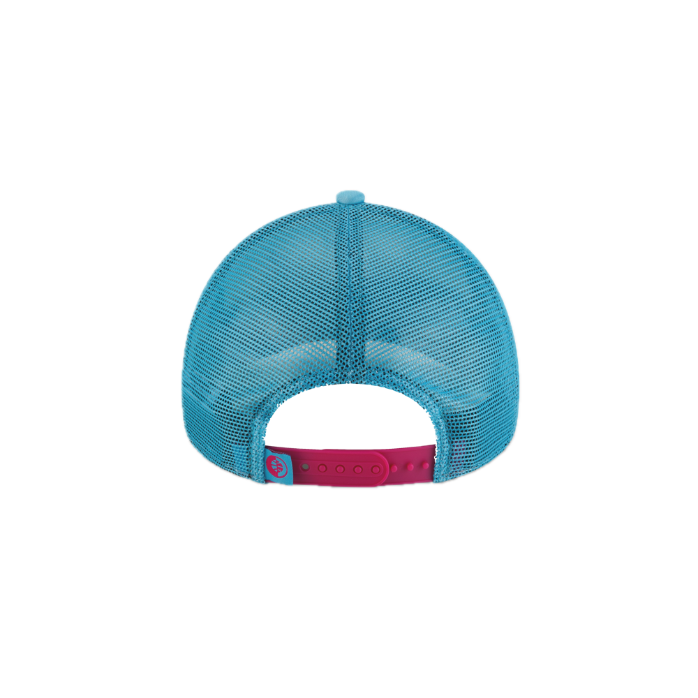 Blue mesh back trucker hat with adjustable pink snapback closure.